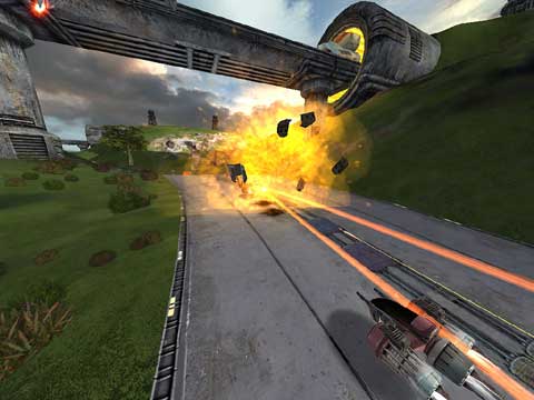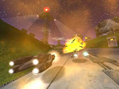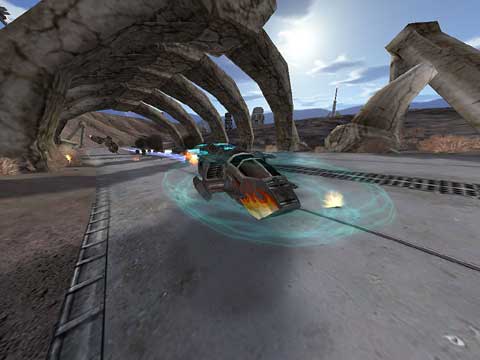 The hovercraft race takes place in a futuristic, sci-fi environment that