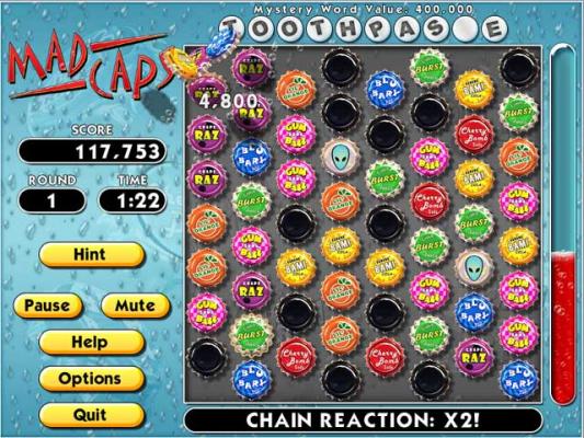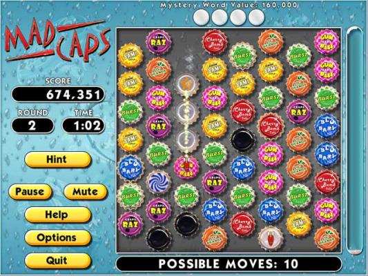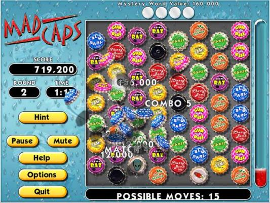 From the warped minds that brought you Chainz comes Mad Caps, a puzzle game gone MAD! Send bottle caps flying with every move to get your fill of tasty soda. Zap caps with Rayguns, target'em with Rockets or let the Alien transmogrify them. Collect letters to spell Mystery Words along with other "under-the-cap" bonuses. Let Mad Caps quench your thirst for fun! Dizzying Array of Kooky Bottle Caps.